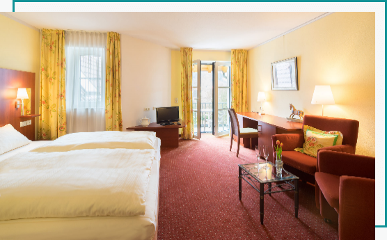 Unsere großen Standardzimmer verfügen über 30 qm Gesamtfläche und sind zur Gartenseite ausgerichtet, mit kleinem Balkon. Unsere normalen Standardzimmer haben wir in drei „Geschmacksrichtungen“: zur Parkseite, zur Gartenseite oder nach vorne. Diese haben 20 qm Gesamtfläche, mit Balkon.